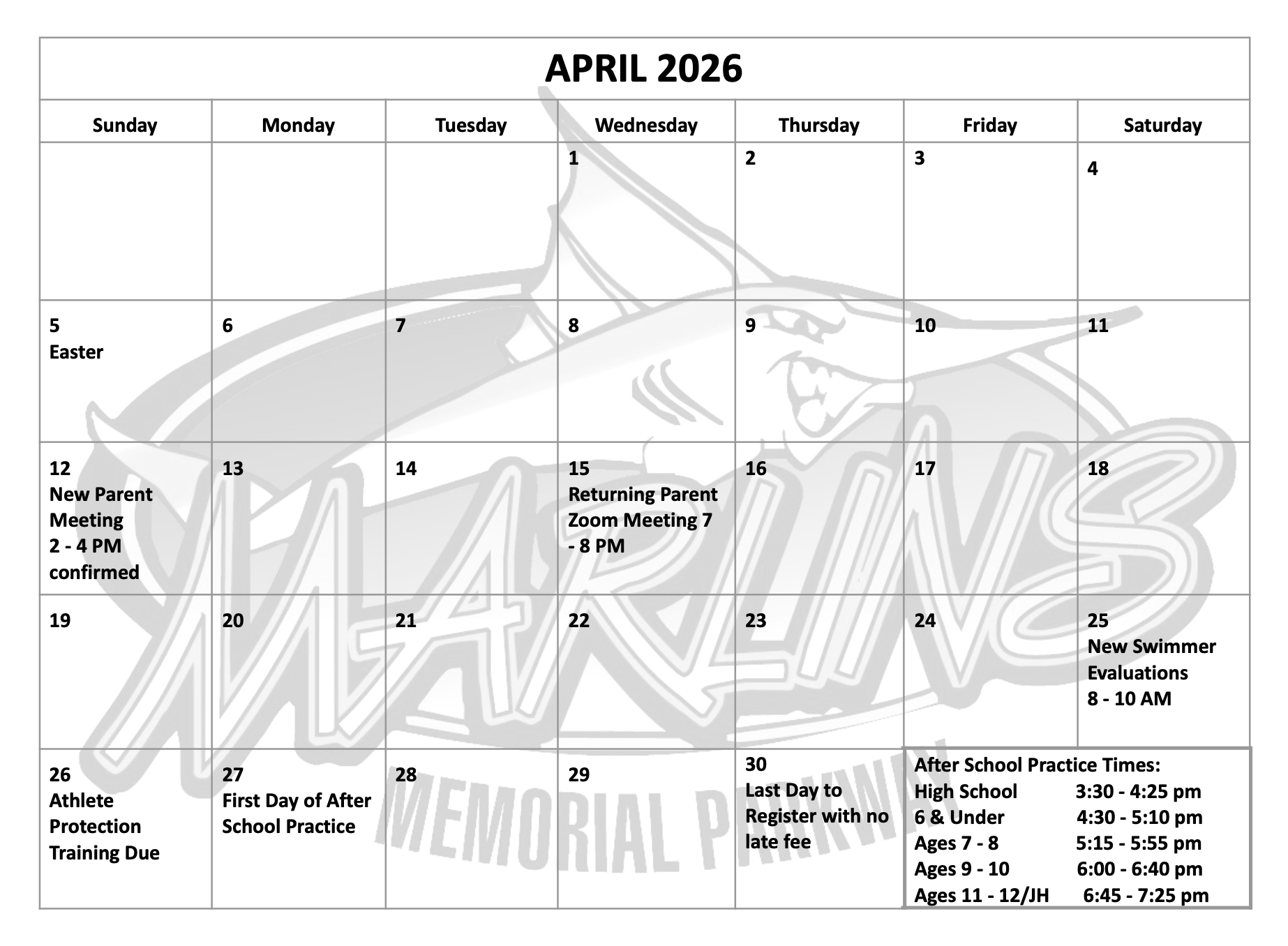 Swim Meets: May 28, June 3, June 13, June 20